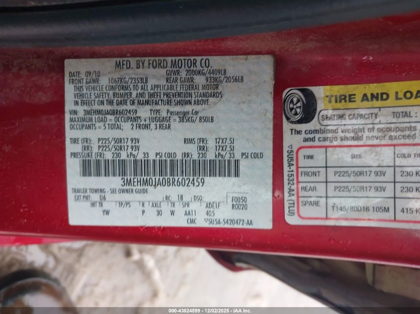 2011 MERCURY MILAN 2011 року Бензин, 2.5, Передній привід, vin - 3MEHM0JA0BR602459 з США