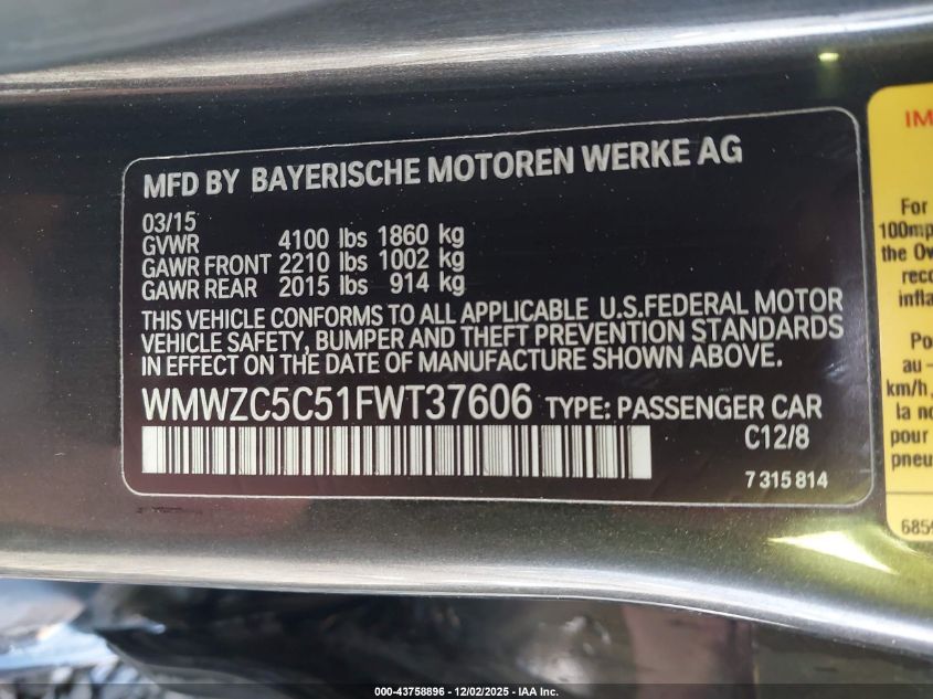 Колір ЧорнийЦиліндри 4Привід Повний привідVIN WMWZC5C51FWT37606Стан Заводиться та їде (перевірено)Ушкодження Передня ліва AutoRIA