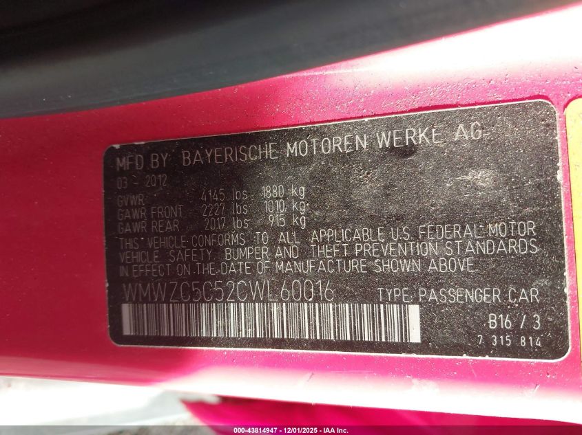 Колір ЧервонийЦиліндри 4Привід Повний привідVIN WMWZC5C52CWL60016Стан СтаціонарноУшкодження Передня і задня Дата аукціону 2025-12-11 AutoRIA