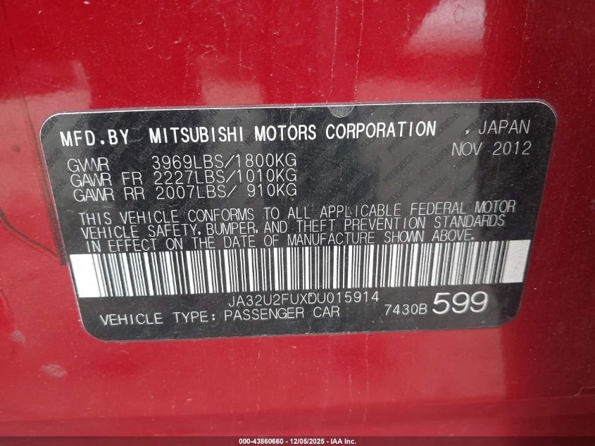2013 MITSUBISHI LANCER 2013 року Бензин, 2.0, Передній привід, vin - JA32U2FUXDU015914 з США