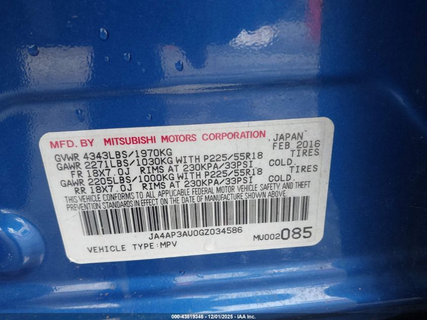 2016 MITSUBISHI OUTLANDER SPORT 2016 року Бензин, 2.0, Передній привід, vin - JA4AP3AU0GZ034586 з США