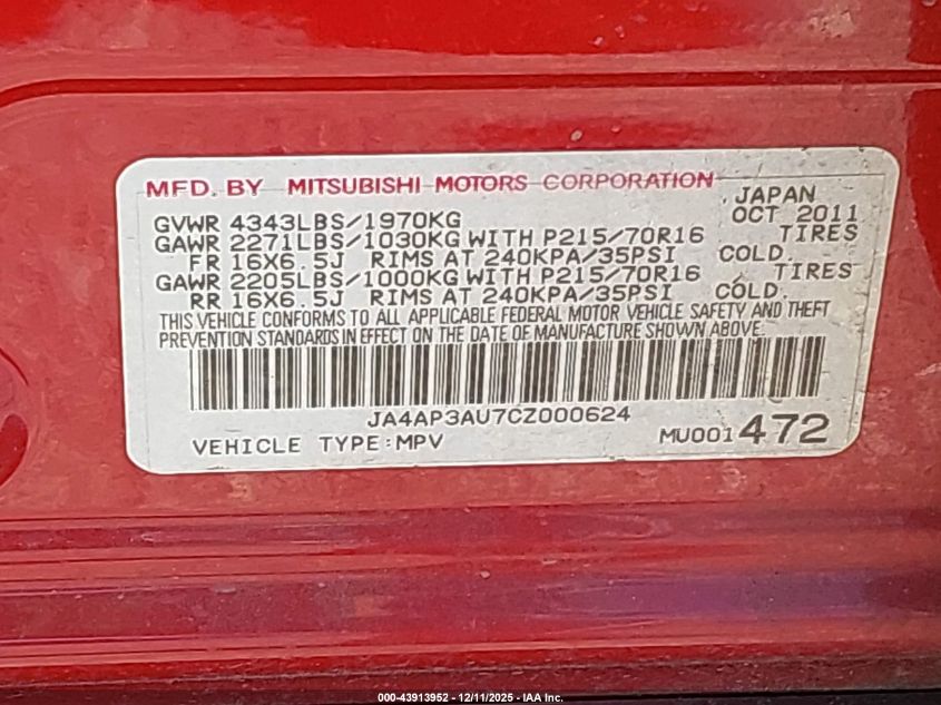 2012 MITSUBISHI OUTLANDER SPORT 2012 року Бензин, 2.0, Передній привід, vin - JA4AP3AU7CZ000624 з США