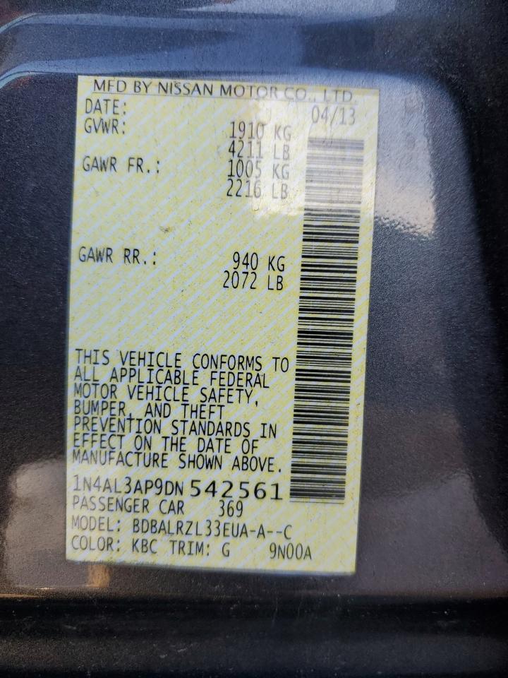 Колір СірийЦиліндри 4VIN 1N4AL3AP9DN542561Стан Заводиться та їде (перевірено)Ушкодження Передня або задняДата аукціону 2025-12-09 AutoRIA