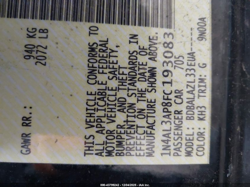 Колір ЧорнийЦиліндри 4Привід Передній привідVIN 1N4AL3AP8FC193083Стан СтаціонарноУшкодження Звичайний знос AutoRIA