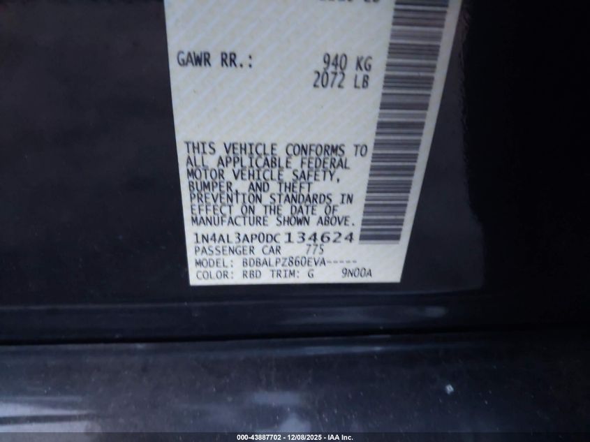 Колір СірийЦиліндри 4Привід Передній привідVIN 1N4AL3AP0DC134624Стан СтаціонарноУшкодження Передня і задня AutoRIA