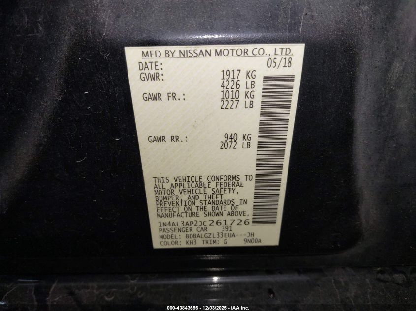 Колір ЧорнийЦиліндри 4Привід Передній привідVIN 1N4AL3AP2JC261726Стан Заводиться та їде (перевірено)Ушкодження Задня AutoRIA