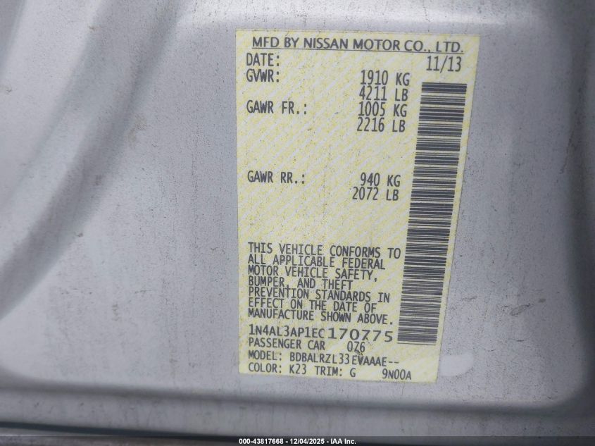 2014 NISSAN ALTIMA 2014 року Бензин, 2.5, Передній привід, vin - 1N4AL3AP1EC170775 з США