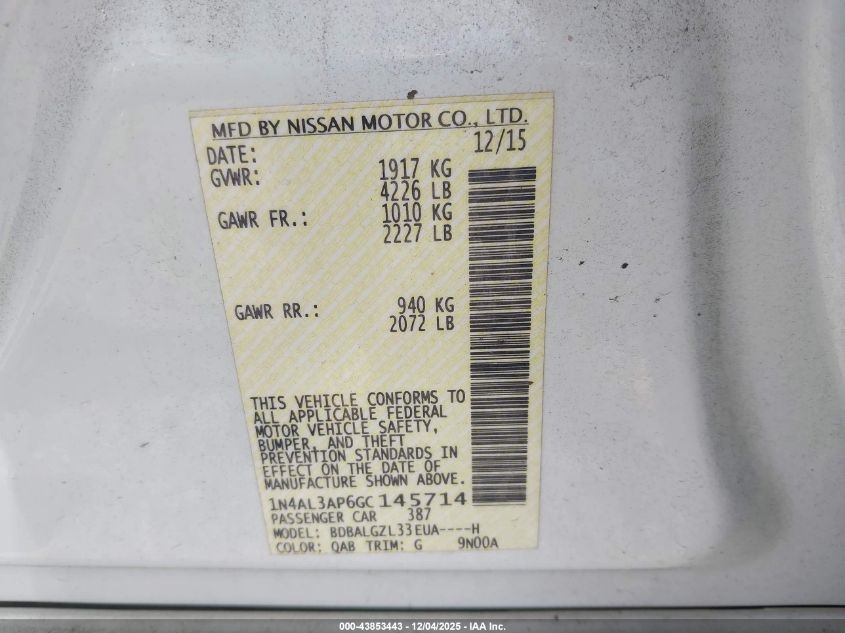 Колір БілийЦиліндри 4Привід Передній привідVIN 1N4AL3AP6GC145714Стан ЗаводитьсяУшкодження Низ AutoRIA