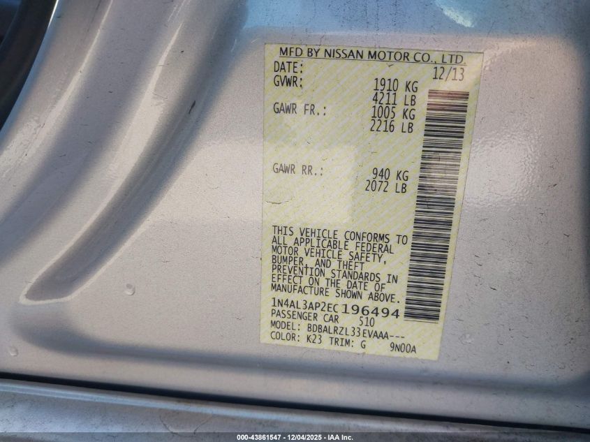 2014 NISSAN ALTIMA 2014 року Бензин, 2.5, Передній привід, vin - 1N4AL3AP2EC196494 з США