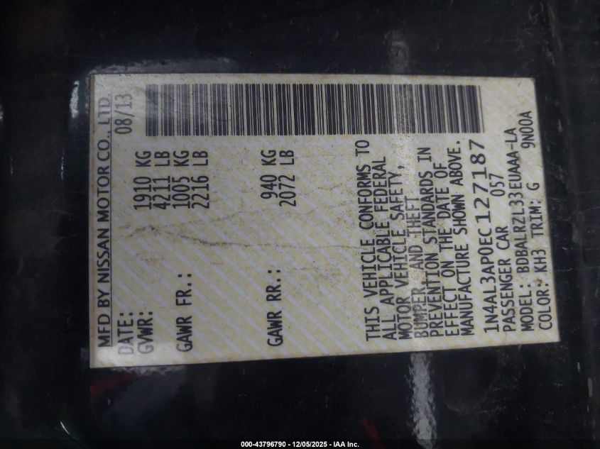 Колір ЧорнийЦиліндри 4Привід Передній привідVIN 1N4AL3AP0EC127187Стан СтаціонарноУшкодження Передня ліва AutoRIA