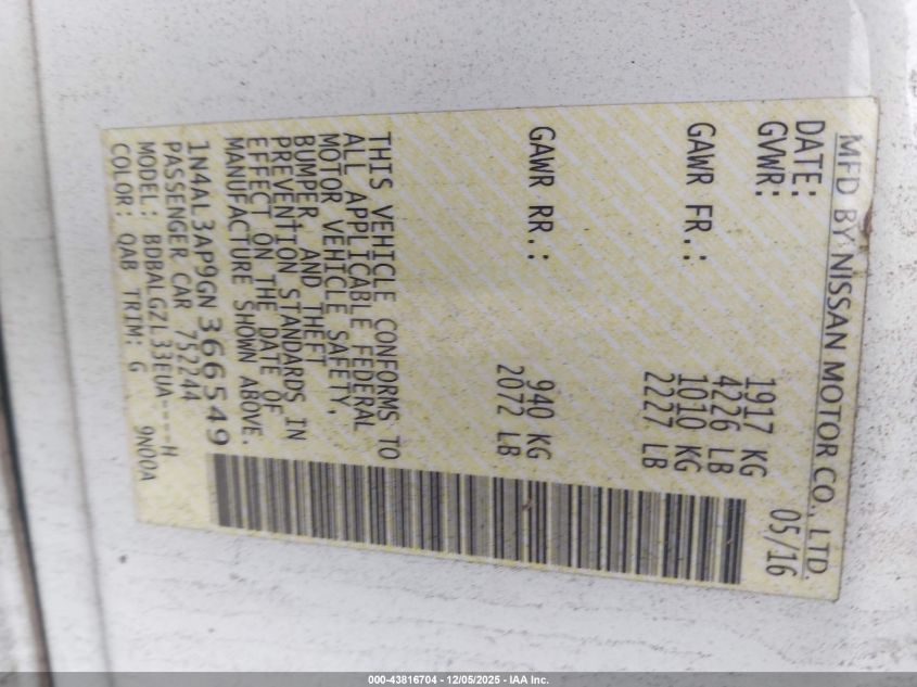 2016 NISSAN ALTIMA 2016 року Бензин, 2.5, Передній привід, vin - 1N4AL3AP9GN366549 з США