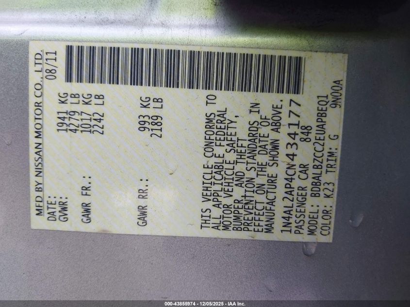 2012 NISSAN ALTIMA 2012 року Бензин, 2.5, Передній привід, vin - 1N4AL2AP4CN434177 з США