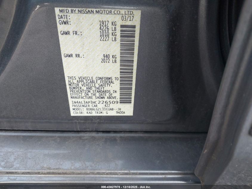 2017 NISSAN ALTIMA 2017 року Бензин, 2.5, Передній привід, vin - 1N4AL3AP3HC226509 з США
