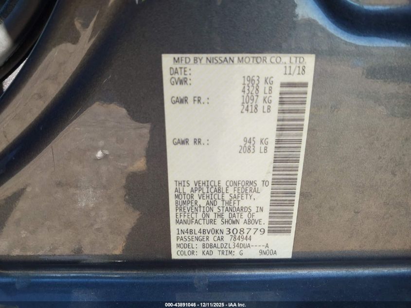 2019 NISSAN ALTIMA 2019 року Бензин, 2.5, Передній привід, vin - 1N4BL4BV0KN308779 з США
