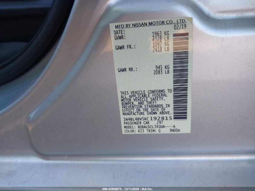 2019 NISSAN ALTIMA 2019 року Бензин, 2.5, Передній привід, vin - 1N4BL4BV5KC192815 з США