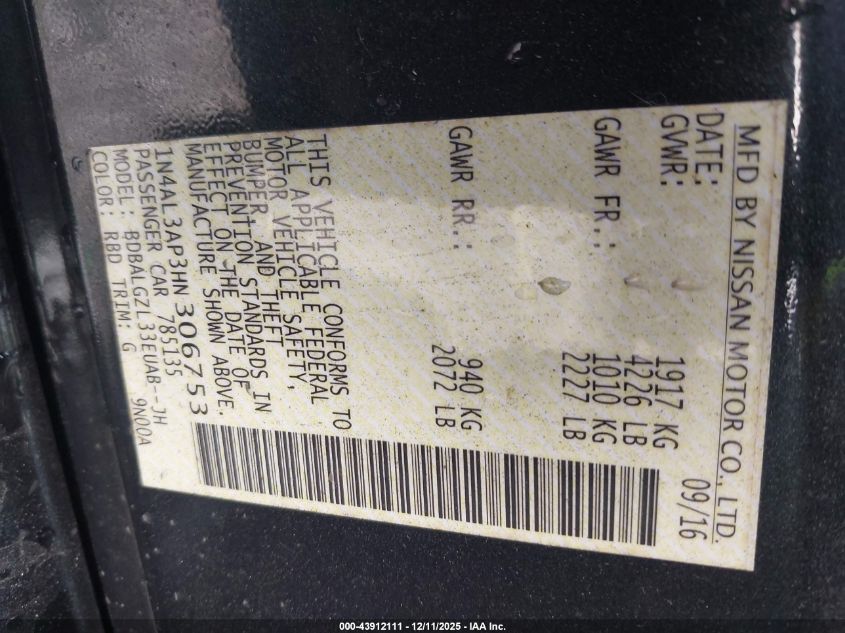 2017 NISSAN ALTIMA 2017 року Бензин, 2.5, Передній привід, vin - 1N4AL3AP3HN306753 з США