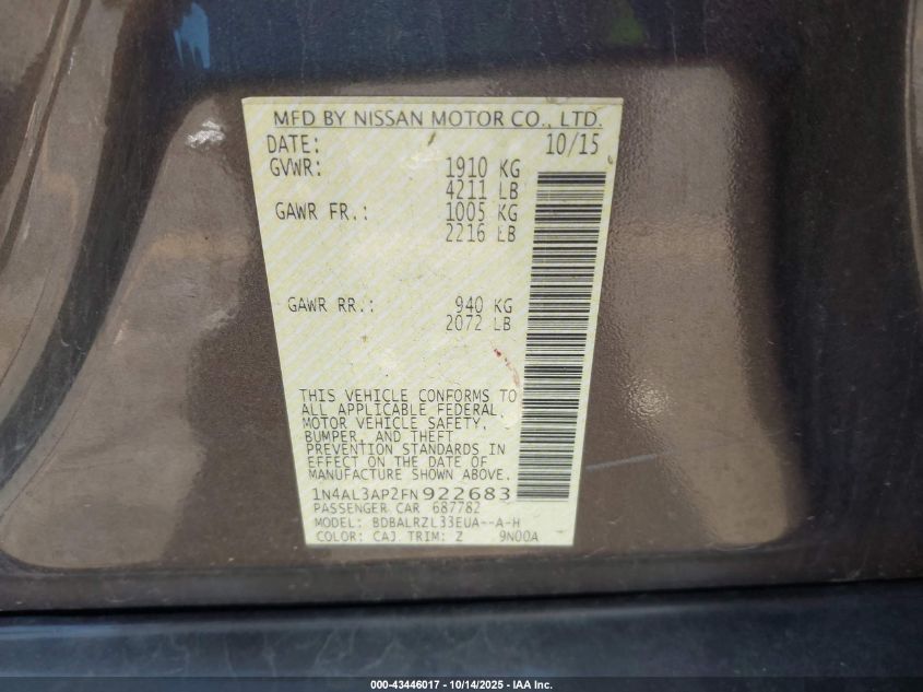 2015 NISSAN ALTIMA 2015 року Бензин, 2.5, Передній привід, vin - 1N4AL3AP2FN922683 з США
