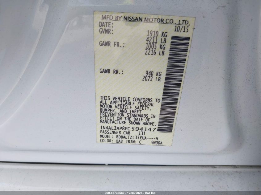 2015 NISSAN ALTIMA 2015 року Бензин, 2.5, Передній привід, vin - 1N4AL3AP8FC594147 з США