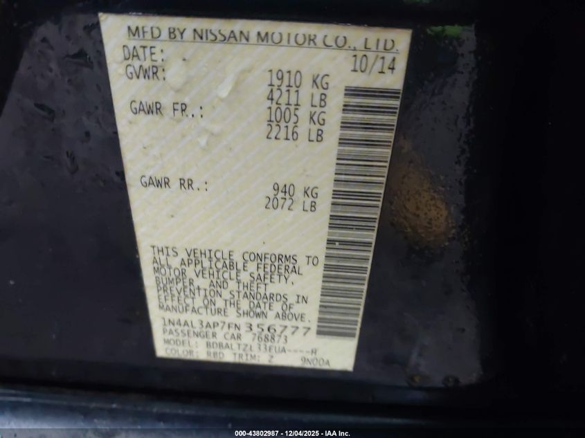 2015 NISSAN ALTIMA 2015 року Бензин, 2.5, Передній привід, vin - 1N4AL3AP7FN356777 з США