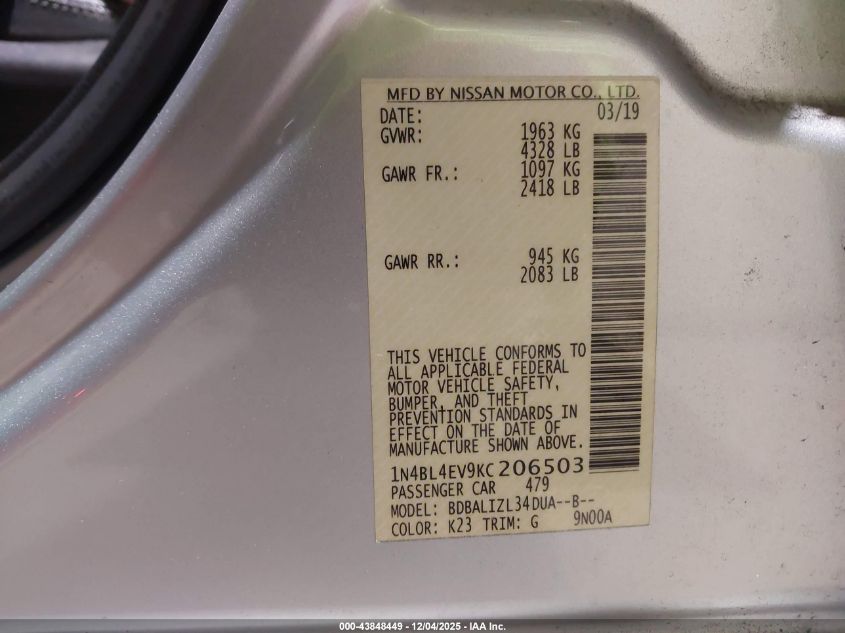 2019 NISSAN ALTIMA 2019 року Бензин, 2.5, Передній привід, vin - 1N4BL4EV9KC206503 з США