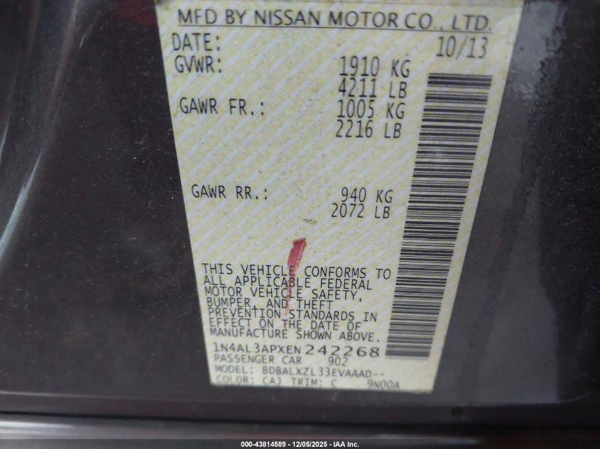 2014 NISSAN ALTIMA 2014 року Бензин, 2.5, Передній привід, vin - 1N4AL3APXEN242268 з США