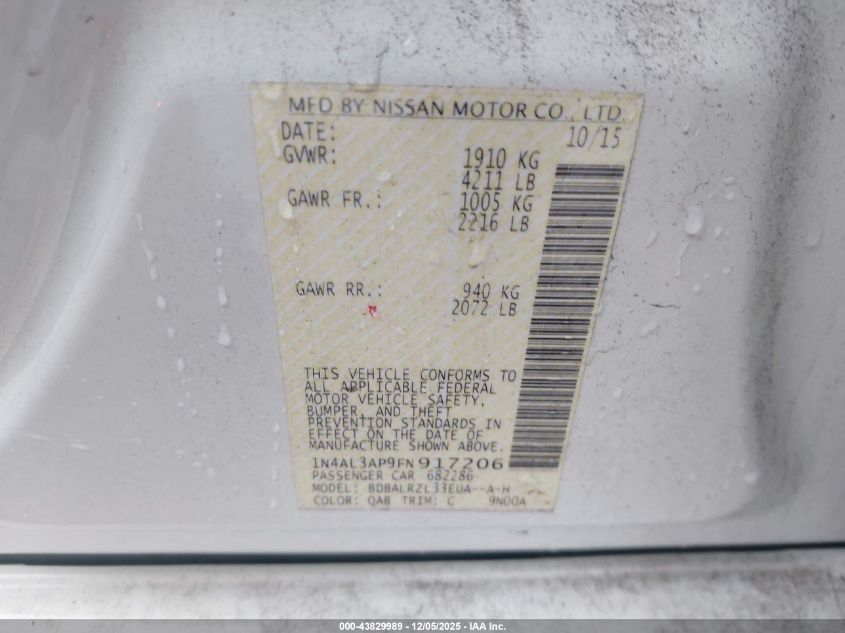 2015 NISSAN ALTIMA 2015 року Бензин, 2.5, Передній привід, vin - 1N4AL3AP9FN917206 з США