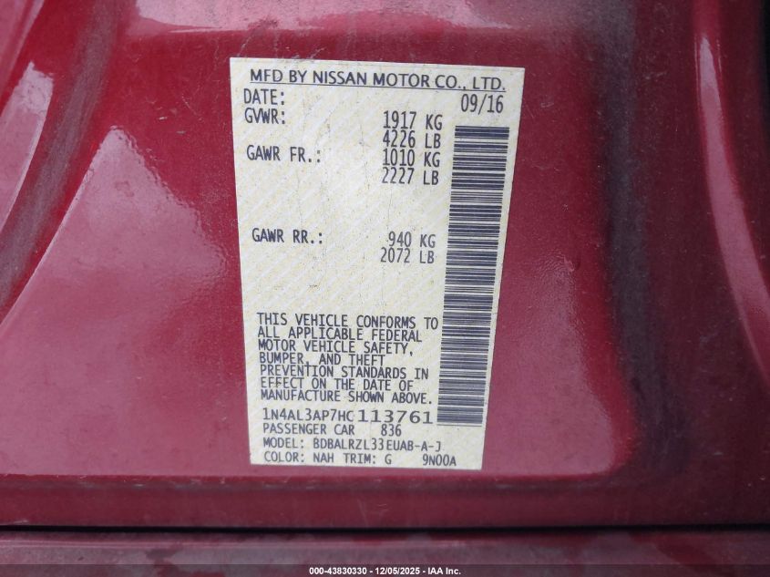 2017 NISSAN ALTIMA 2017 року Бензин, 2.5, Передній привід, vin - 1N4AL3AP7HC113761 з США