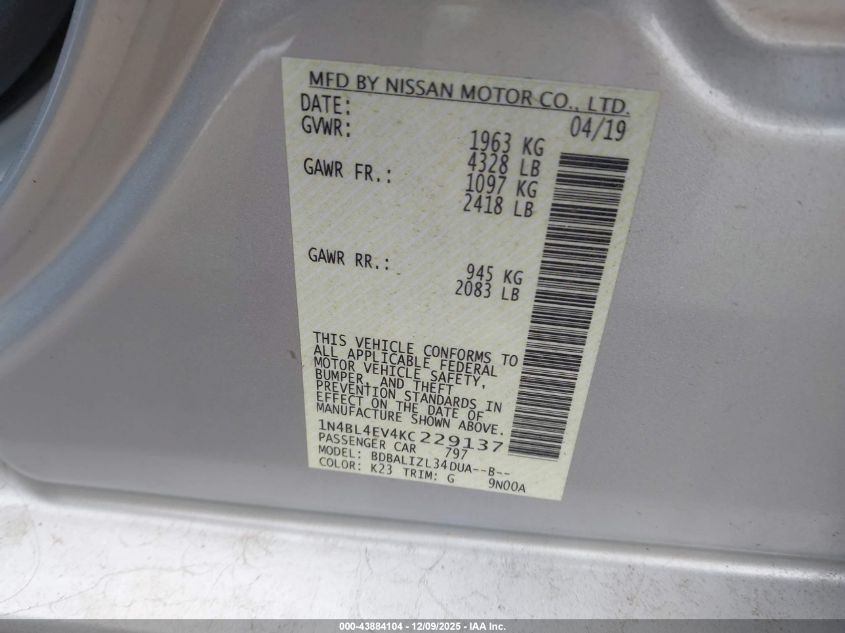 2019 NISSAN ALTIMA 2019 року Бензин, 2.5, Передній привід, vin - 1N4BL4EV4KC229137 з США