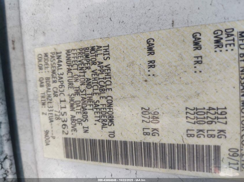 Колір БілийЦиліндри 4Привід Передній привідVIN 1N4AL3AP6JC115362Стан Заводиться та їде (перевірено)Ушкодження Передня або задняДата аукціону 2025-12-22 AutoRIA