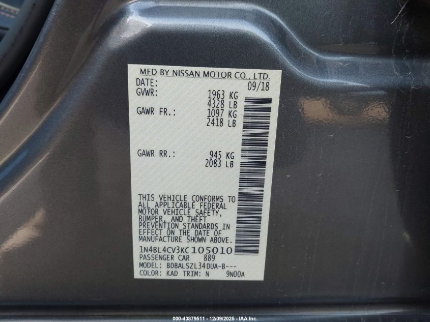 2019 NISSAN ALTIMA 2019 року Бензин, 2.5, Передній привід, vin - 1N4BL4CV3KC105010 з США