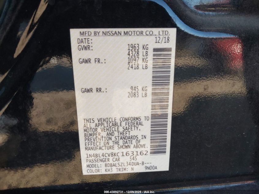 2019 NISSAN ALTIMA 2019 року Бензин, 2.5, Передній привід, vin - 1N4BL4CV8KC163162 з США