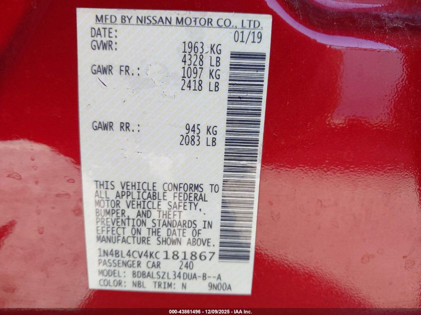 2019 NISSAN ALTIMA 2019 року Бензин, 2.5, Передній привід, vin - 1N4BL4CV4KC181867 з США