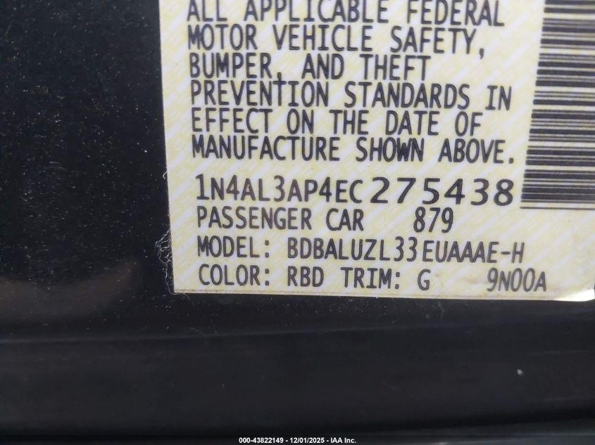 Колір ЧорнийЦиліндри 4Привід Передній привідVIN 1N4AL3AP4EC275438Стан Заводиться та їде (перевірено)Ушкодження Передня або задня AutoRIA