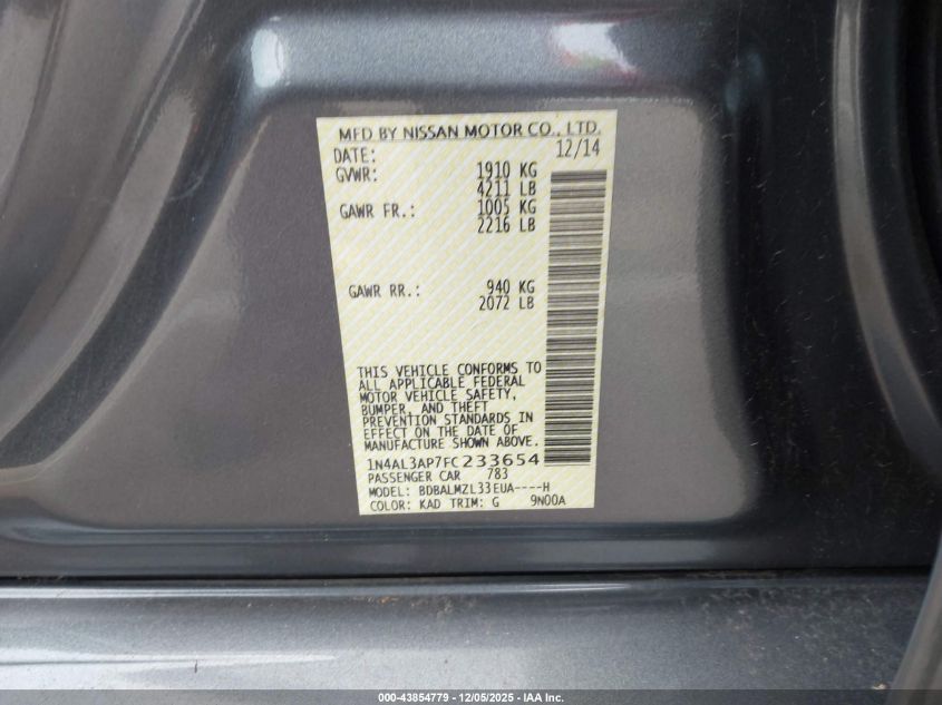 2015 NISSAN ALTIMA 2015 року Бензин, 2.5, Передній привід, vin - 1N4AL3AP7FC233654 з США