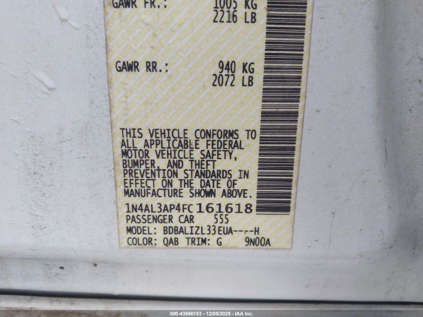 Колір БілийЦиліндри 4Привід Передній привідVIN 1N4AL3AP4FC161618Стан СтаціонарноУшкодження Передня або задня AutoRIA
