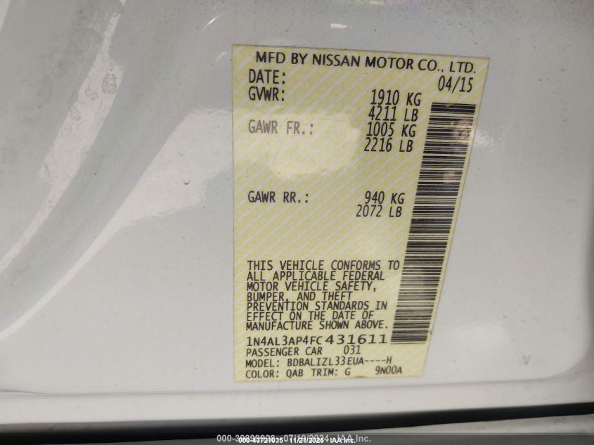 Колір БілийЦиліндри 4Привід Передній привідVIN 1N4AL3AP4FC431611Стан НевідомоУшкодження Передня або задня AutoRIA