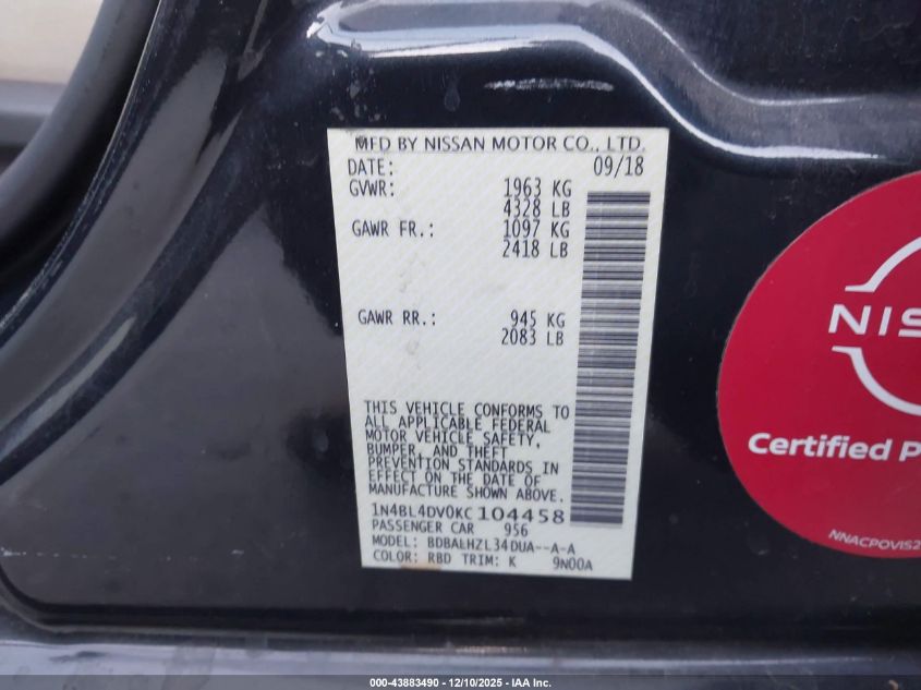 2019 NISSAN ALTIMA 2019 року Бензин, 2.5, Передній привід, vin - 1N4BL4DV0KC104458 з США
