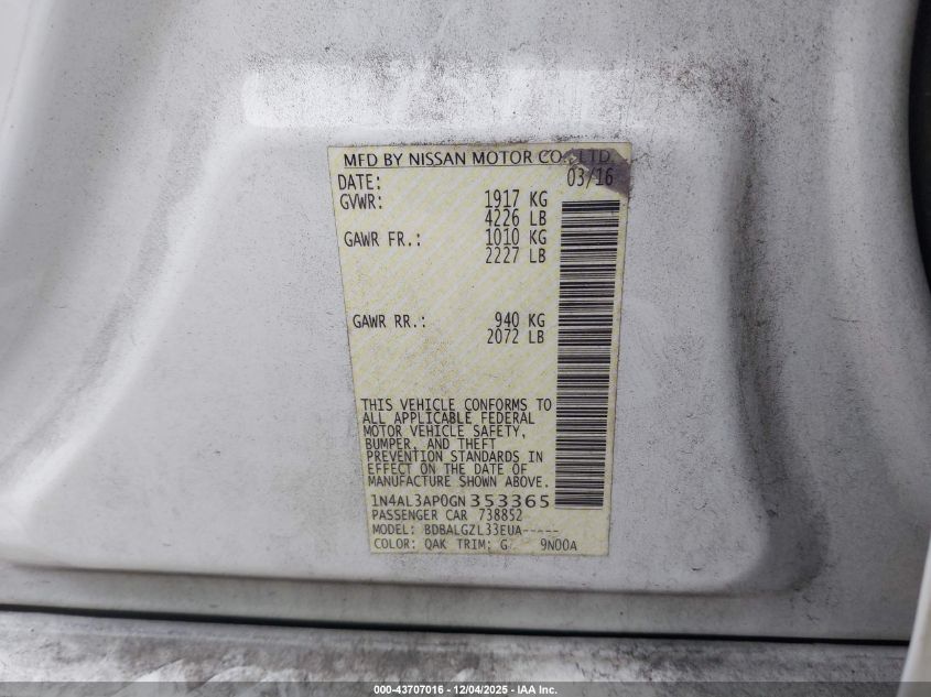 2016 NISSAN ALTIMA 2016 року Бензин, 2.5, Передній привід, vin - 1N4AL3AP0GN353365 з США