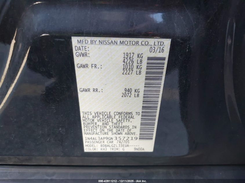 2016 NISSAN ALTIMA 2016 року Бензин, 2.5, Передній привід, vin - 1N4AL3AP9GN357219 з США