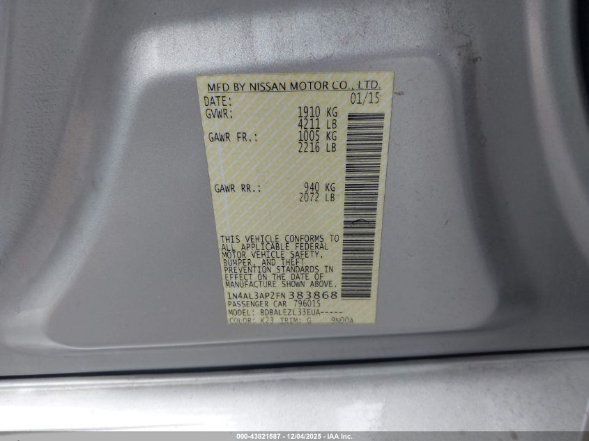2015 NISSAN ALTIMA 2015 року Бензин, 2.5, Передній привід, vin - 1N4AL3AP2FN383868 з США