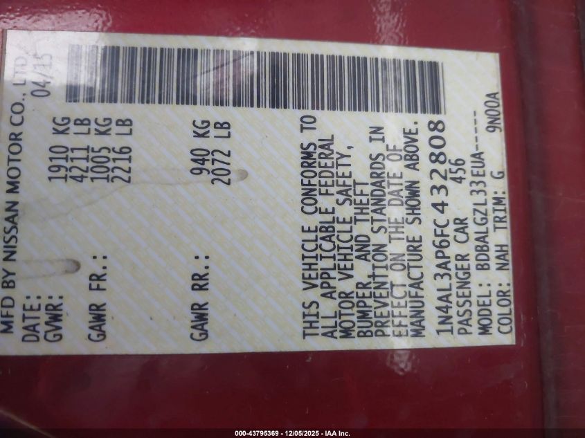 2015 NISSAN ALTIMA 2015 року Бензин, 2.5, Передній привід, vin - 1N4AL3AP6FC432808 з США