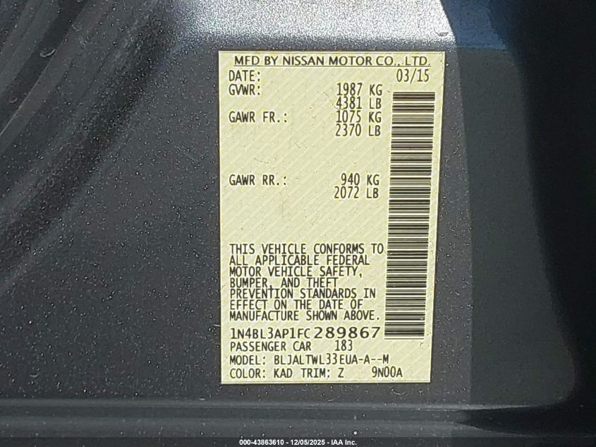 2015 NISSAN ALTIMA 2015 року Бензин, 3.5, Передній привід, vin - 1N4BL3AP1FC289867 з США