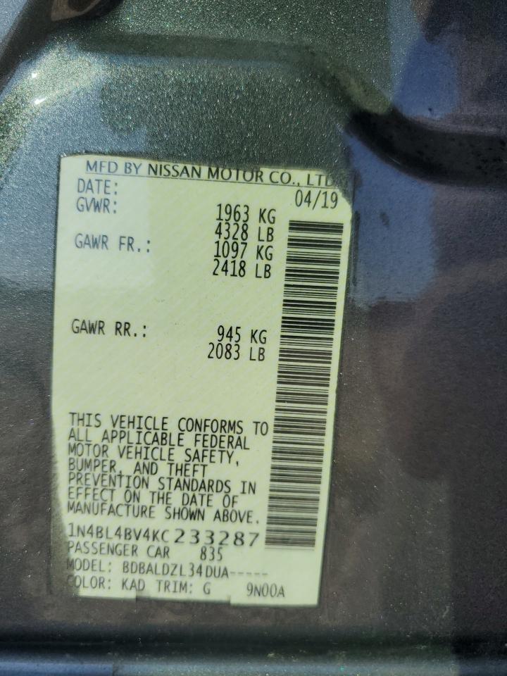 Колір СірийЦиліндри 4VIN 1N4BL4BV4KC233287Стан Заводиться та їде (перевірено)Ушкодження Передня або задня AutoRIA