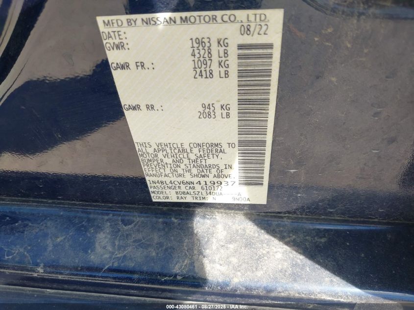 2022 NISSAN ALTIMA 2022 року Бензин, 2.5, Передній привід, vin - 1N4BL4CV6NN419937 з США