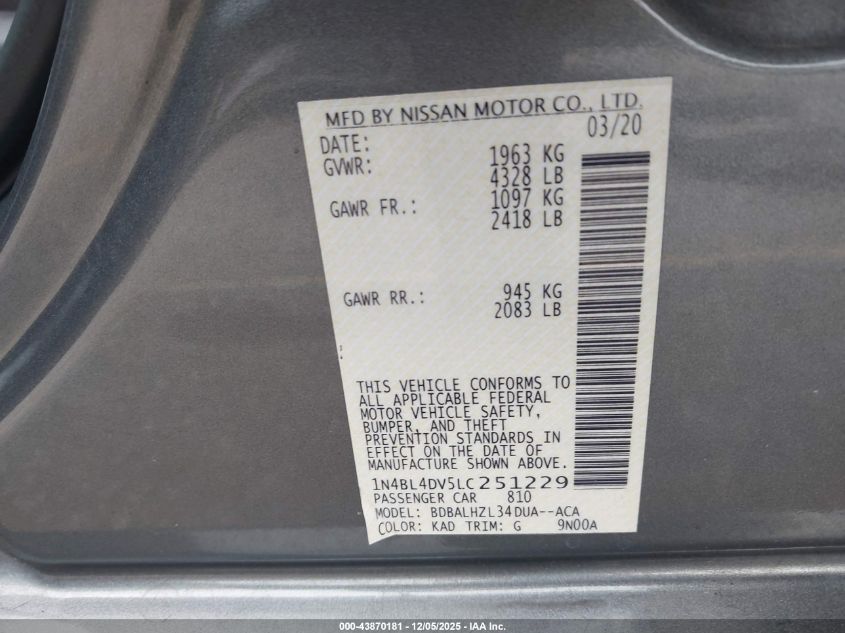 2020 NISSAN ALTIMA 2020 року Бензин, 2.5, Передній привід, vin - 1N4BL4DV5LC251229 з США