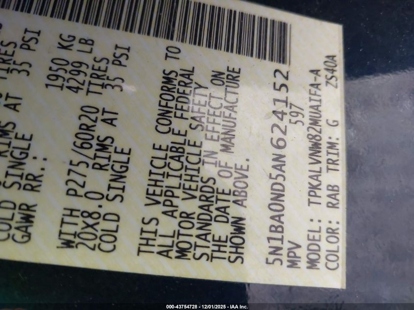 Колір СинійЦиліндри 8VIN 5N1BA0ND5AN624152Стан ЗаводитьсяУшкодження МоторДата аукціону 2025-12-11