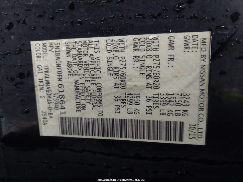 2015 NISSAN ARMADA 2015 року Бензин, 5.6, , vin - 5N1BA0NF0FN618641 з США
