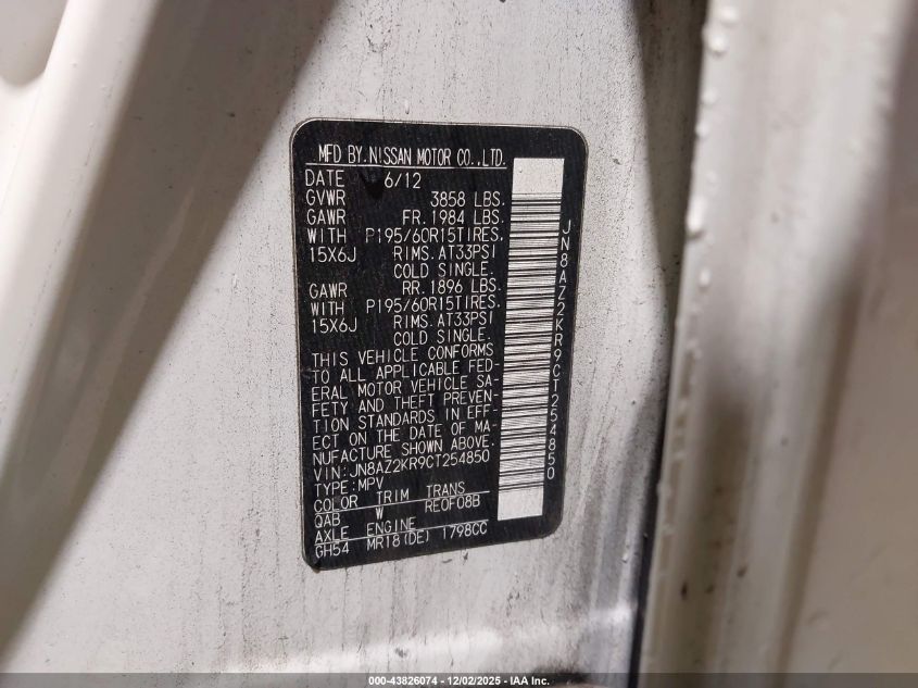 2012 NISSAN CUBE 2012 року Бензин, 1.8, Передній привід, vin - JN8AZ2KR9CT254850 з США