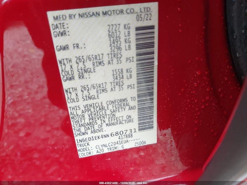 2022 NISSAN FRONTIER 2022 року Бензин, 3.8, Повний привід, vin - 1N6ED1EK4NN680731 з США