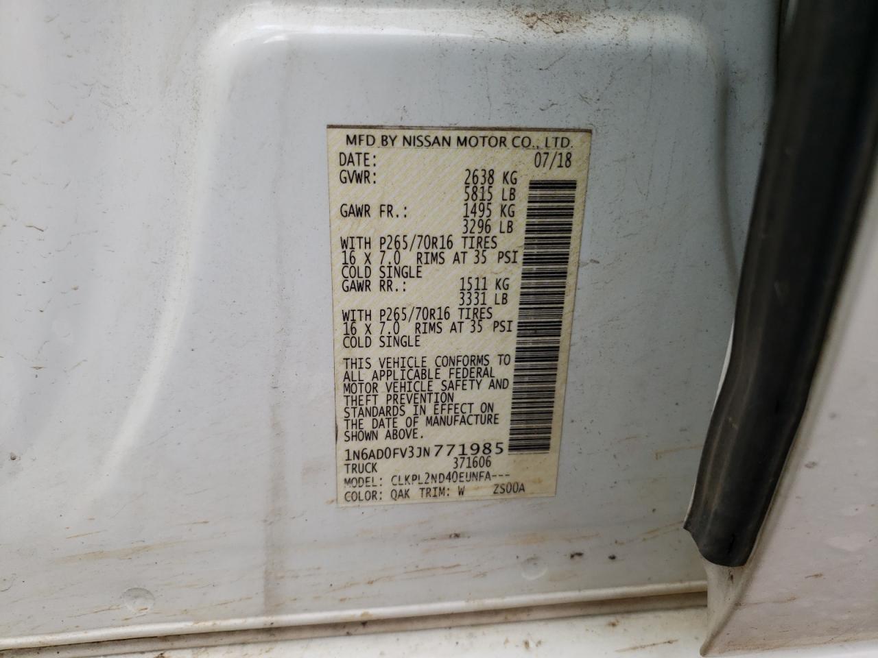 Колір БілийЦиліндри 6Привід 4x4 з заднім приводомVIN 1N6AD0FV3JN771985Стан Заводиться та їде (перевірено)Ушкодження Передня або задняДата аукціону 2025-12-12 AutoRIA